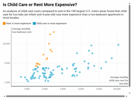 A recent analysis of the 100 largest U.S. metro areas found that the cost of child care for a family with two young children is more expensive than the average rent in each respective market.